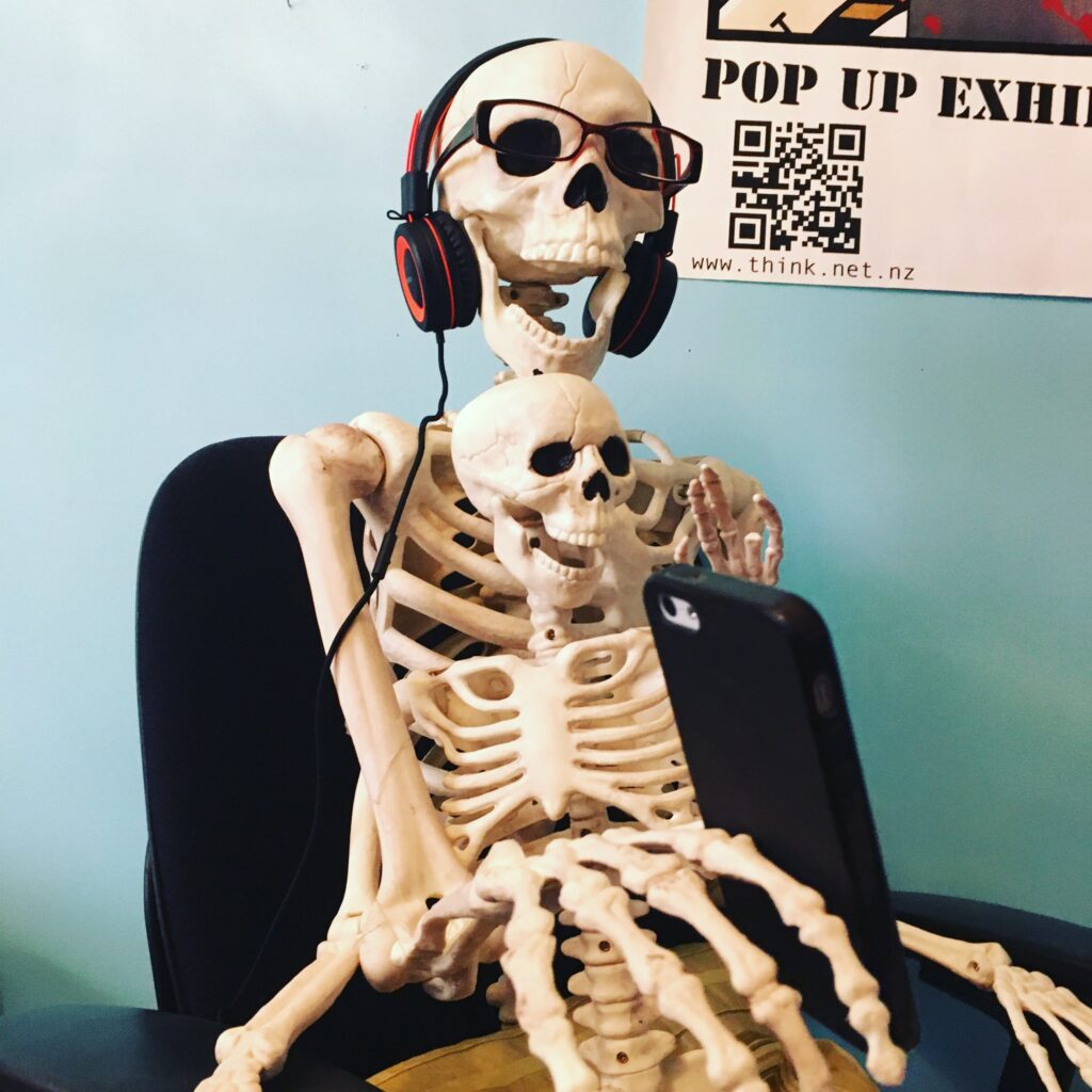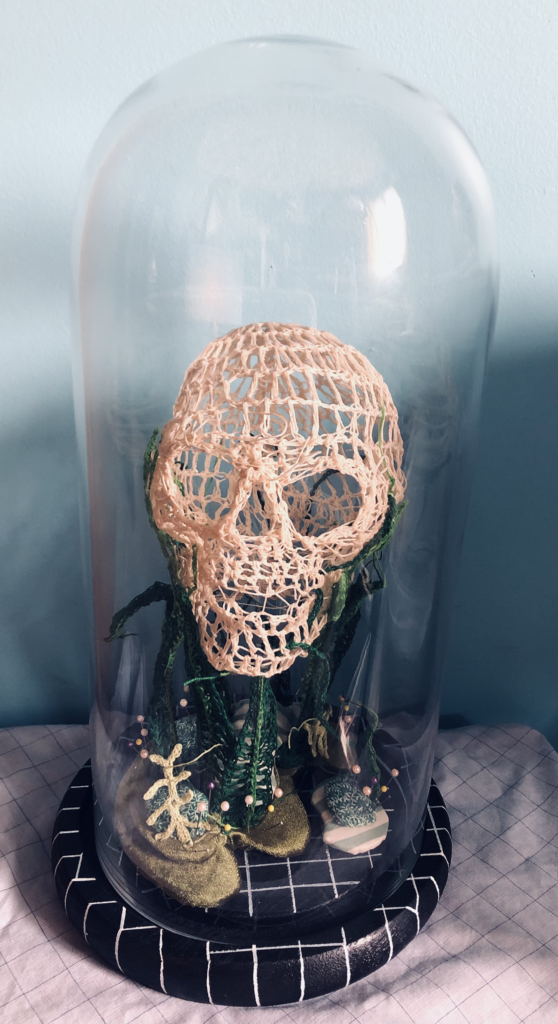 I began photographing my kid’s skeleton they got from their grandmother as a way to explore death through visuals. As a former photography major, and current photographic practices academic/researcher and certified Death Doula, I thought putting those skills together would help me and others examine our fears, anxieties, questions, and beliefs about living, dying and death. I began showing them on Instagram @dr.damart. After awhile I was told to get my own skeleton – so started an ongoing collection of skeletons: First Hepburn, then Thana; now I proudly own beautiful morbid works by www.caitlintmccormack.com, a lovely handcrafted local piece that is a coffin with snake and spider skeletons, and over the years such kind students have shared their expressions. I recently bought a piece from @j.danversstudio (check them out on Instagram).